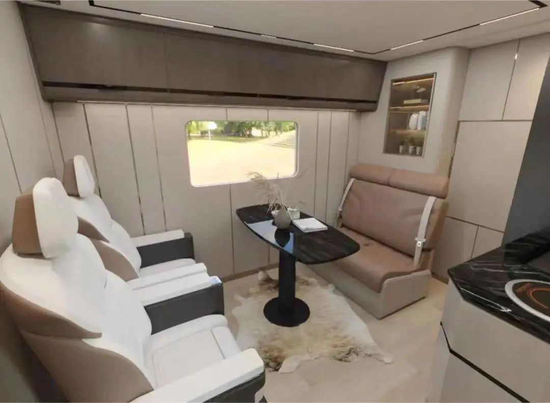 探索家·珠峰的车内共有两层,一层布局了2个独立座椅,座椅支持6向电动调节,可一键150°躺平,并带有腿托、加热、通风、按摩功能,如电磁炉、174L冰箱、3M反渗透直饮水过滤器、洗衣机等配置也都设在一层。探索家▪珠峰的二层则为双人大床搭配三人沙发的布局,并有50寸投影仪。同时,探索家·珠峰还配备了一体式实木电地暖,且各层独立配备48V直流变频空调。