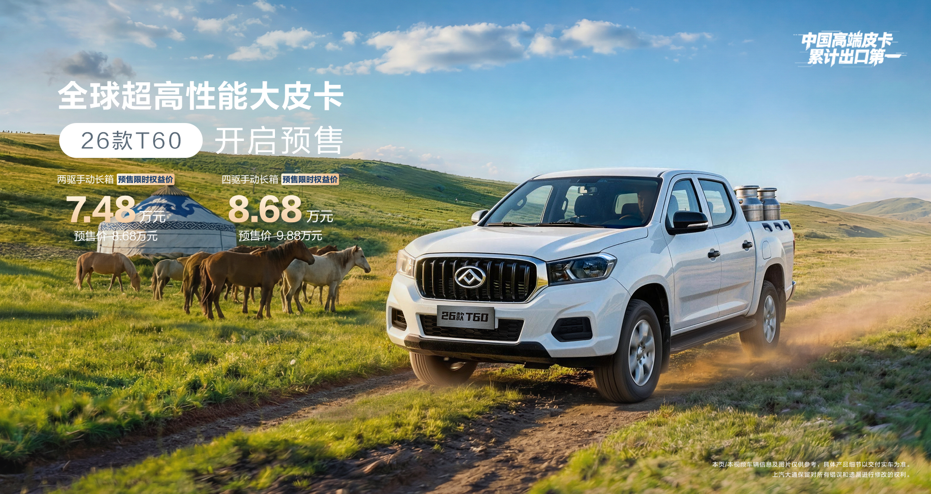 作为中国高端皮卡出口累计第一品牌,上汽大通始终以全球超高性能的产品实力深耕皮卡市场,此次全新星际L与26款T60的预售开启,不仅为不同创富群体带来了多样化的优质选择,更以亲民的价格和丰厚的权益,让高性能皮卡触手可及!
